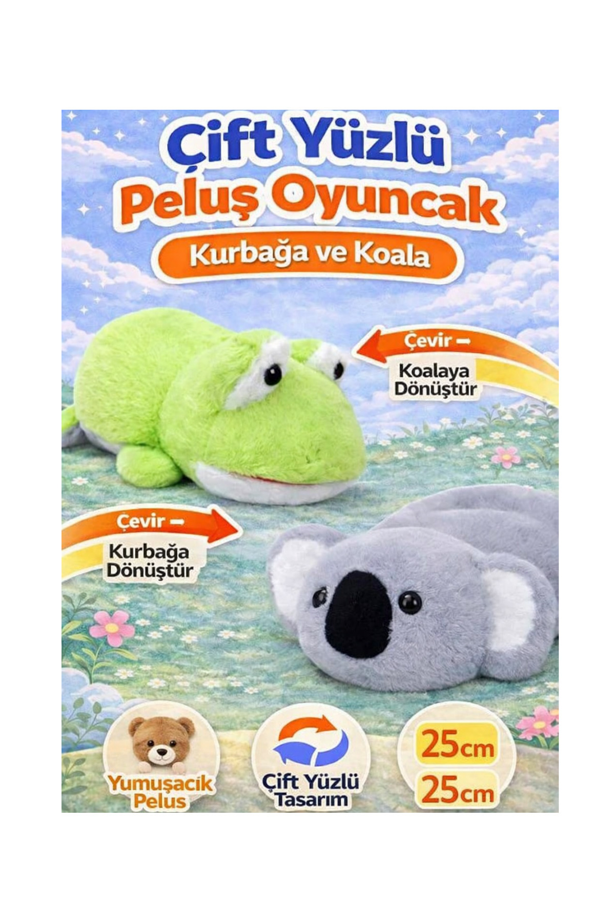 Çift Taraflı Dönüşebilen Peluş Oyuncak – 2’si 1 Arada Eğlence! Çocuklar için iki farklı karakter tek oyuncakta! Tek hamlede ters çevir, anında başka bir hayvana dönüşsün! Sevimli tasarımı ve ultra yumuşak dokusuyla hem oyuncak hem uyku arkadaşı ❤️ Evde, arabada, kreşte, seyahatte çocukların vazgeçilmezi! ✨ Özellikler ✔ Çift taraflı dönüşebilen tasarım (2 karakter 1 peluş) ✔ Süper yumuşak premium peluş kumaş ✔ Çocuk sağlığına uygun, güvenli malzeme ✔ Dayanıklı dikiş ve uzun ömürlü kullanım ✔ Sarılmalık, uyku arkadaşı ve oyun oyuncağı ✔ Hafif ve taşınabilir 🎯 Neden Tercih Edilmeli? • Tek oyuncakla iki kat eğlence • Hayal gücünü geliştirir • Duyusal ve motor becerileri destekler • Harika doğum günü & karne hediyesi • Kız ve erkek çocuklar için uygun 📏 Boyut 📐 Ortalama: 25 cm Eğlenceli tasarımıyla çocuk odalarının en tatlı üyesi olmaya hazır! Şimdi sepete ekle, miniklere sürpriz yap